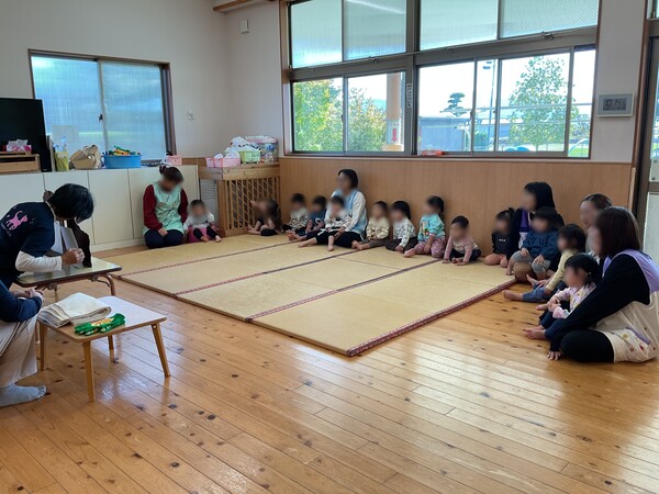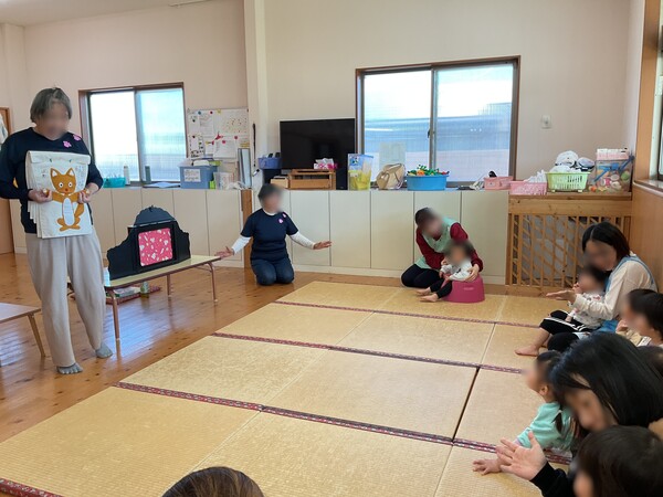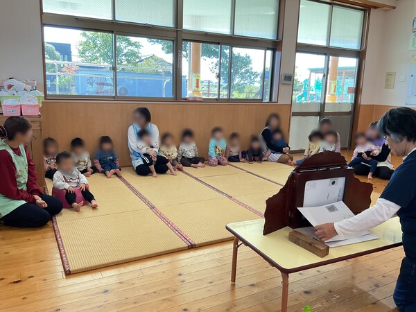 昨日は山猫軒さんが読み聞かせに来てくださいました!手遊びの「キャベツーのなかかーら」が聞こえると自然と子ども達は「ピピッ」と歌いだしました。紙芝居では、「バナナ、バナナ、だれのおやつ?」と聞かれ、「おさるさ〜ん」と大きな声で答えたり、布絵本でも「いないいない」と顔をかくし、「ばあっ!」ととびきりの笑顔を見せてくれました。