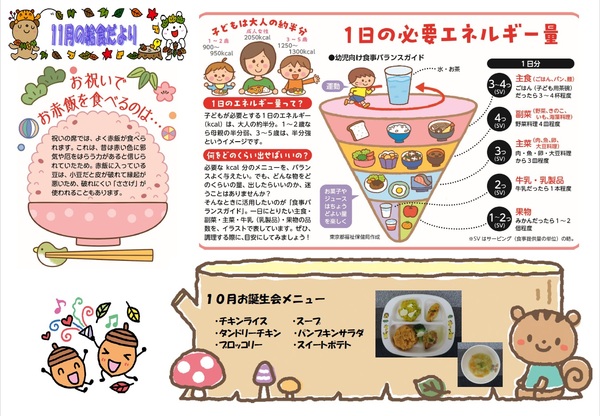 11月の給食だよりでは、子どもの食事と栄養バランスについて紹介しています。お祝いで赤飯を食べる意味を説明し、厄除けや成長の願いが込められていることを伝えています。また、子どもが1日に必要とするエネルギー量を示し、1〜2歳は約900〜950kcal、3〜5歳は約1250〜1300kcalが目安であると紹介。主食・主菜・副菜・乳製品・果物をバランスよく摂ることの大切さを「食事バランスガイド」で分かりやすく解説しています。